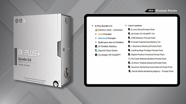 - The AI Plus Bundle 2.0 includes over 100,000+ categorized prompts in various niches.